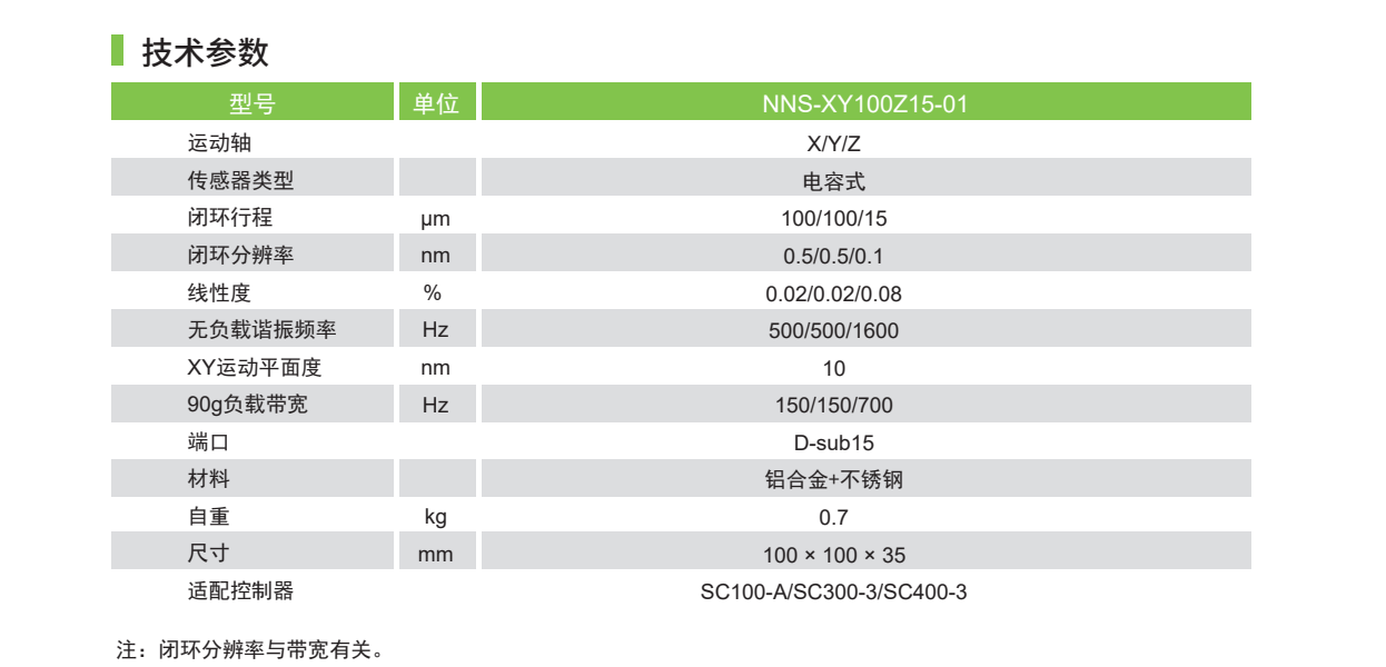 NNS-XY100Z15-01是一款高精度三維納米定位平臺。具有尺寸小,頻率高,帶寬高,精度高的特點。行程100/100/15μm,分辨率 0.5/0.5/0.1nm。