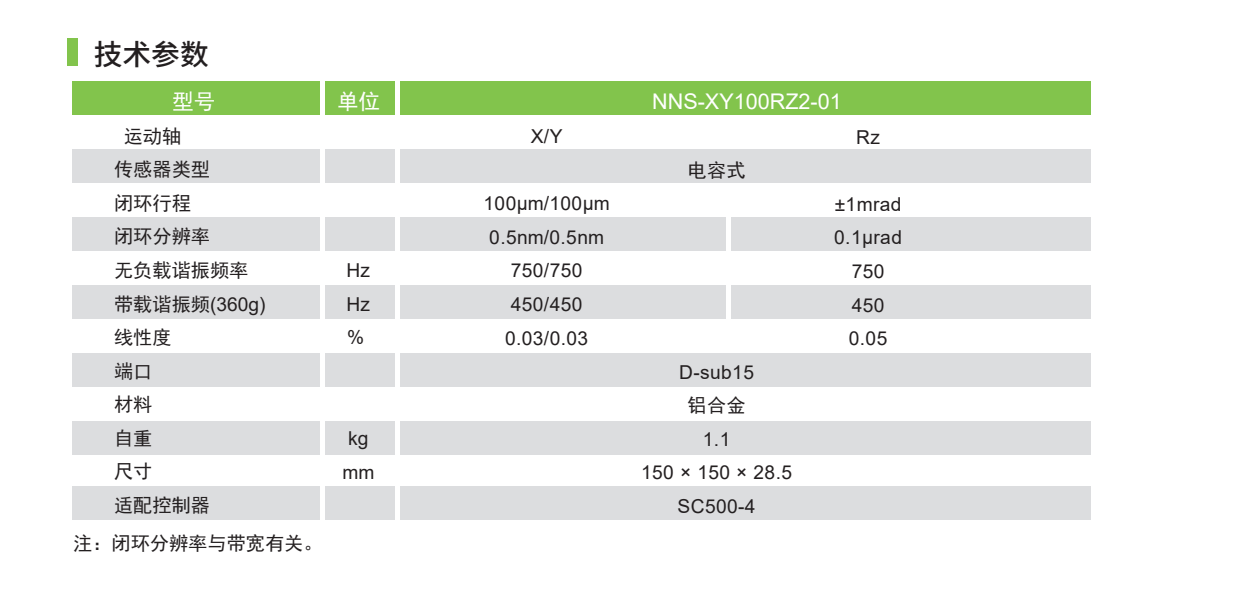 NNS-XY100RZ2-01是一款集成平移和旋轉(zhuǎn)的高精度納米運動臺。電容傳感器全閉環(huán)控制,精度高,結(jié)構(gòu)緊湊。大通孔設(shè)計,陽極氧化黑工藝,滿足多場景應(yīng)用。