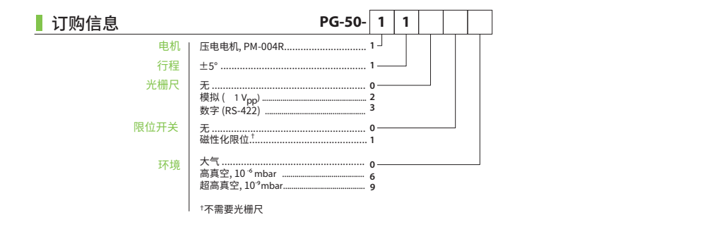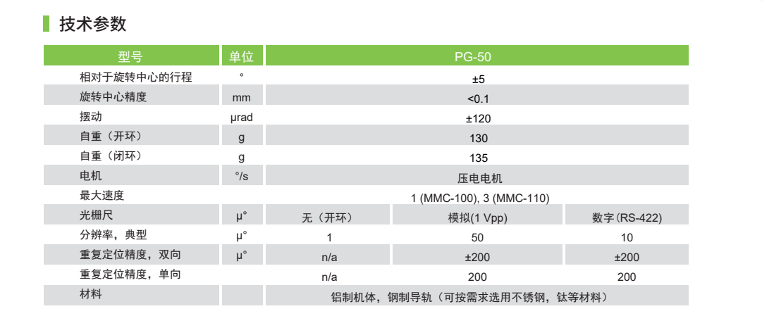 PG-50角位移平臺(tái)的緊湊設(shè)計(jì),在有限的空間中應(yīng)用表現(xiàn)良好。通過(guò)預(yù)加載的交叉滾子導(dǎo)軌實(shí)現(xiàn)高剛度運(yùn)動(dòng)。這些載物臺(tái)可以安裝在正交的、節(jié)省空間的布置中,以實(shí)現(xiàn)俯仰和翻滾調(diào)節(jié)。可提供真空(10-9mbar)中操作的版本。PG-50兼容MMC-100和MMC-110控制器。